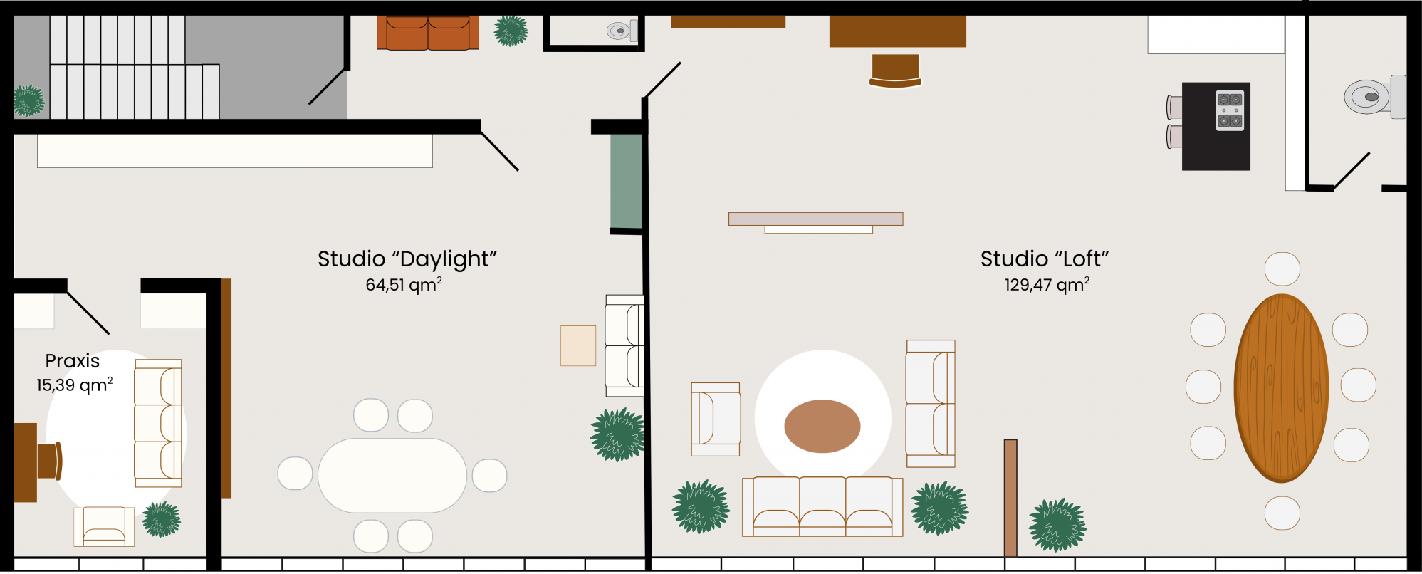 Unser Studio bietet hierfür zwei Bereiche: das helle, minimalistische Tageslichtstudio „Daylight“ und das großzügige, wohnlich eingerichtete „Loft“, mit Ziegelsteinwänden, modernen Möbeln und vielen Pflanzen.